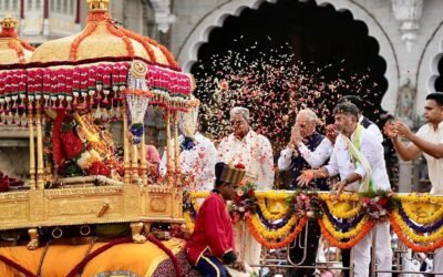 ಸಪ್ತ ಸಾಗರ ವಾರ್ತೆ, ಮೈಸೂರು, ಅ. 2: ಮೈಸೂರು ಅರಮನೆ ಆವರಣದಲ್ಲಿ ವಿಜಯ ದಶಮಿ ನಿಮಿತ್ತ ಗುರುವಾರ ಅಭಿಮನ್ಯು ಹೊತ್ತ ಅಂಬಾರಿಯಲ್ಲಿನ ಚಾಮುಂಡೇಶ್ವರಿ ದೇವಿಗೆ ಡಿಸಿಎಂ ಡಿ ಕೆ ಶಿವಕುಮಾರ್ ಅವರು ಪುಷ್ಪಾರ್ಚನೆ ಮಾಡಿದರು. ಸಿಎಂ ಸಿದ್ದರಾಮಯ್ಯ, ಹೈಕೋರ್ಟ್ ಮುಖ್ಯ ನ್ಯಾಯಮೂರ್ತಿಗಳಾದ ವಿಭು ಬಖ್ರು, ಸಚಿವರಾದ ಮಹದೇವಪ್ಪ, ಶಿವರಾಜ್ ತಂಗಡಗಿ, ಸಂಸದ ಯದುವೀರ್ ಒಡೆಯರ್, ಮುಖ್ಯ ಕಾರ್ಯದರ್ಶಿ ಡಾ. ಶಾಲಿನಿ ರಜನೀಶ್, ಜಿಲ್ಲಾಧಿಕಾರಿ ಲಕ್ಷೀಕಾಂತ್ ರೆಡ್ಡಿ, ಪೊಲೀಸ್ ಕಮಿಷನರ್ ಸೀಮಾ ಲಾಟ್ಕರ್ ಉಪಸ್ಥಿತರಿದ್ದರು.