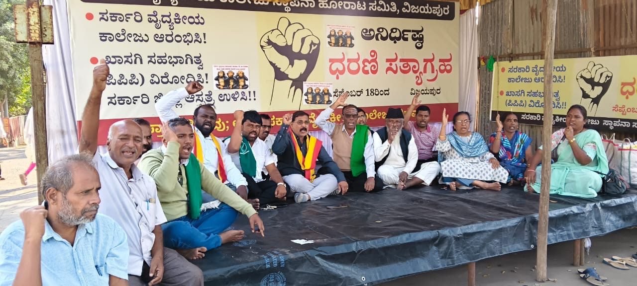 ವಿಜಯಪುರ ನಗರದ ಡಾ. ಬಿಆರ್ ಅಂಬೇಡ್ಕರ್ ವೃತ್ತದಲ್ಲಿ ಜಿಲ್ಲೆಗೆ ಸರ್ಕಾರಿ ವೇದಿಕೆಯ ಮಹಾವಿದ್ಯಾಲಯ ಸ್ಥಾಪನೆಗಾಗಿ ಆಗ್ರಹಿಸಿ ಸರ್ಕಾರದ ಉದ್ದೇಶಿತ ಖಾಸಗಿಕರಣವನ್ನು ವಿರೋಧಿಸಿ ನಡೆಯುತ್ತಿರುವ ಧರಣಿ ಭಾನುವಾರ 88ನೇ ದಿನ ಪೂರೈಸಿದ್ದು, ಸರ್ಕಾರ ಜಿಲ್ಲೆಯ ಹೋರಾಟಗಾರರು ಹಾಗೂ ಜನರ ಬೇಡಿಕೆಗೆ ಸ್ಪಂದಿಸದ ಹಿನ್ನೆಲೆಯಲ್ಲಿ ಸರಕಾರಿ ವೈದ್ಯಕೀಯ ಕಾಲೇಜು ಸ್ಥಾಪನೆಗಾಗಿ ಹೋರಾಟ ಸಮಿತಿ ಪ್ರಮುಖರು ಇಂದು ಸತ್ಯಾಗ್ರಹ ವೇದಿಕೆಯಲ್ಲಿ ಸಭೆ ನಡೆಸಿ ಡಿ. ೧೫ ರಿಂದ ಅಹೋರಾತ್ರಿ ಧರಣಿ ಪ್ರಾರಂಭಿಸಲು ನಿರ್ಣಯ ಕೈಗೊಂಡಿದ್ದಾರೆ .