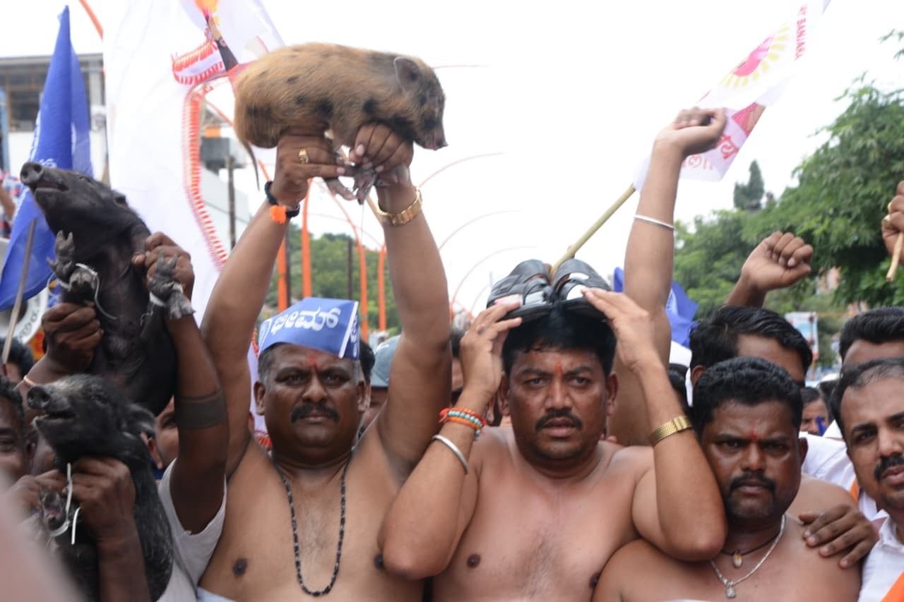 ಡಾ. ಅರವಿಂದ ಜಾಧವ ಅರೆಬೆತ್ತಲೆ ಮೂಲಕ ಪಾದರಕ್ಷೆಗಳನ್ನು ತಲೆಯ ಮೇಲೆ ಹೊತ್ತು ಸಂಪೂರ್ಣ ಹೋರಾಟದಲ್ಲಿ ಕಾಂಗ್ರೆಸ್ ಸರಕಾರ ವಿರುದ್ಧ ಧಿಕ್ಕಾರ ಕೂಗಿ ಆಕ್ರೋಶ ಹೊರ ಹಾಕಿದರು.