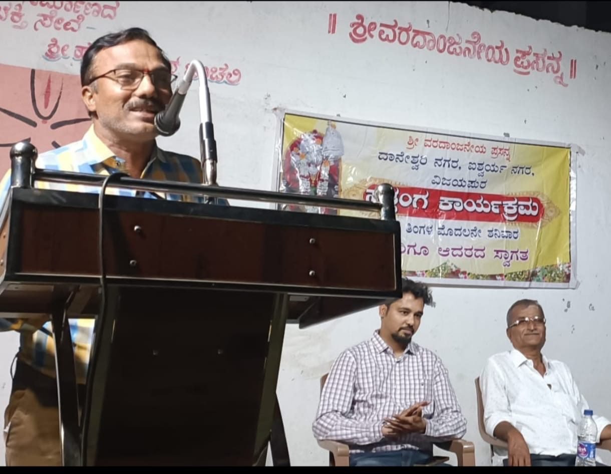 ನಗರದ ಆಶ್ರಮರಸ್ತೆಯ ಐಶ್ವರ್ಯ ಬಡಾವಣೆಯ ವರದಾಂಜನೆಯ ದೇವಸ್ಥಾನದಲ್ಲಿ ನಡೆದ ೫೪೫ ನೇ ಮಾಸಿಕ ಸತ್ಸಂಗ ಕಾರ್ಯಕ್ರಮದಲ್ಲಿ ಅತಿಥಿ ಉಪನ್ಯಾಸ ನೀಡುತ್ತಿದ್ದರು.