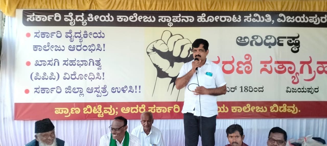 ರಾಜ್ಯ ಸರ್ಕಾರದ ನಿರ್ಲಕ್ಷ್ಯ ಧೋರಣೆಯನ್ನು ಖಂಡಿಸಿ, ಪಿಪಿಪಿ (ಪಬ್ಲಿಕ್-ಪ್ರೈವೇಟ್ ಪಾರ್ಟ್ನರ್‌ಶಿಪ್) ಮಾದರಿಯನ್ನು ಕೈಬಿಟ್ಟು ಸಂಪೂರ್ಣ ಸರ್ಕಾರಿ ಹೂಡಿಕೆಯೊಂದಿಗೆ ವೈದ್ಯಕೀಯ ಕಾಲೇಜು ಸ್ಥಾಪಿಸುವಂತೆ ಒತ್ತಾಯಿಸಿ ಹೋರಾಟಗಾರರು ಜಿಲ್ಲೆಯ ಡಾ. ಬಿ.ಆರ್. ಅಂಬೇಡ್ಕರ್ ವೃತ್ತದಲ್ಲಿ ಹೋರಾಟ ನಡೆಸುತ್ತಿದ್ದಾರೆ.